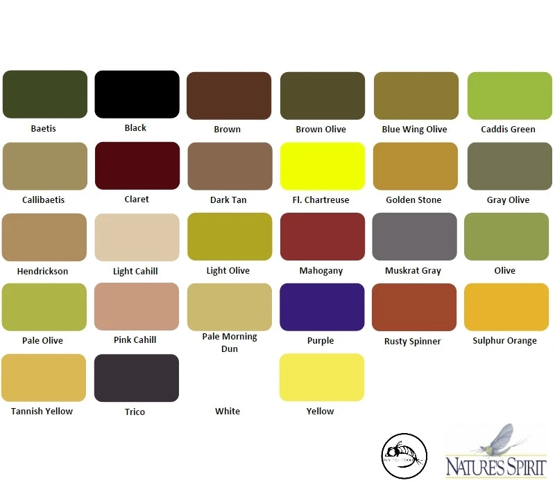 | Color | Baetis, Brown, Brown Olive, BWO, Caddis Green, Callibaetis, Claret, Dark Tan, Fl. Chartreuse, Golden Stone, Gray Olive, Hendrickson, Light Cahill, Light Olive, Mahogany, Muskrat Gray, Purple, Olive, Pale Olive, Pink Cahill, PMD, Combo Color Pack, Rusty Spinner, Sulphur Orange, Tannish Yellow, Trico, White, Yellow, Black |